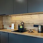 Es gibt zudem die voll ausgestattete Küchenzeile, die mit einem Herd und einem Geschirrspüler ausgestattet ist.